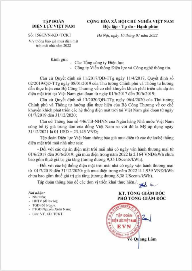 - Đối với các hệ thống điện mặt trời mái nhà có ngày vận hành thương mại từ 01/7/2019 đến 31/12/2020: giá mua điện mặt trời của EVN trong năm 2022 là 1.939 VNĐ/kWh (năm 2021 là 1.938 VNĐ/kWh) chưa bao gồm thuế giá trị gia tăng (tương đương 8,38 Uscents/kWh).